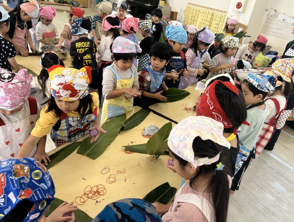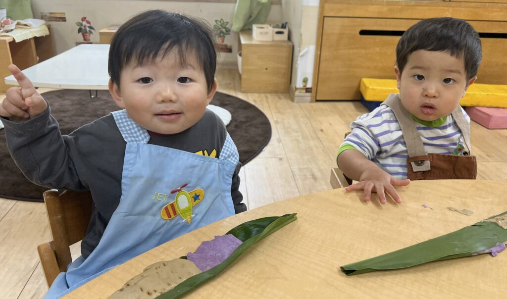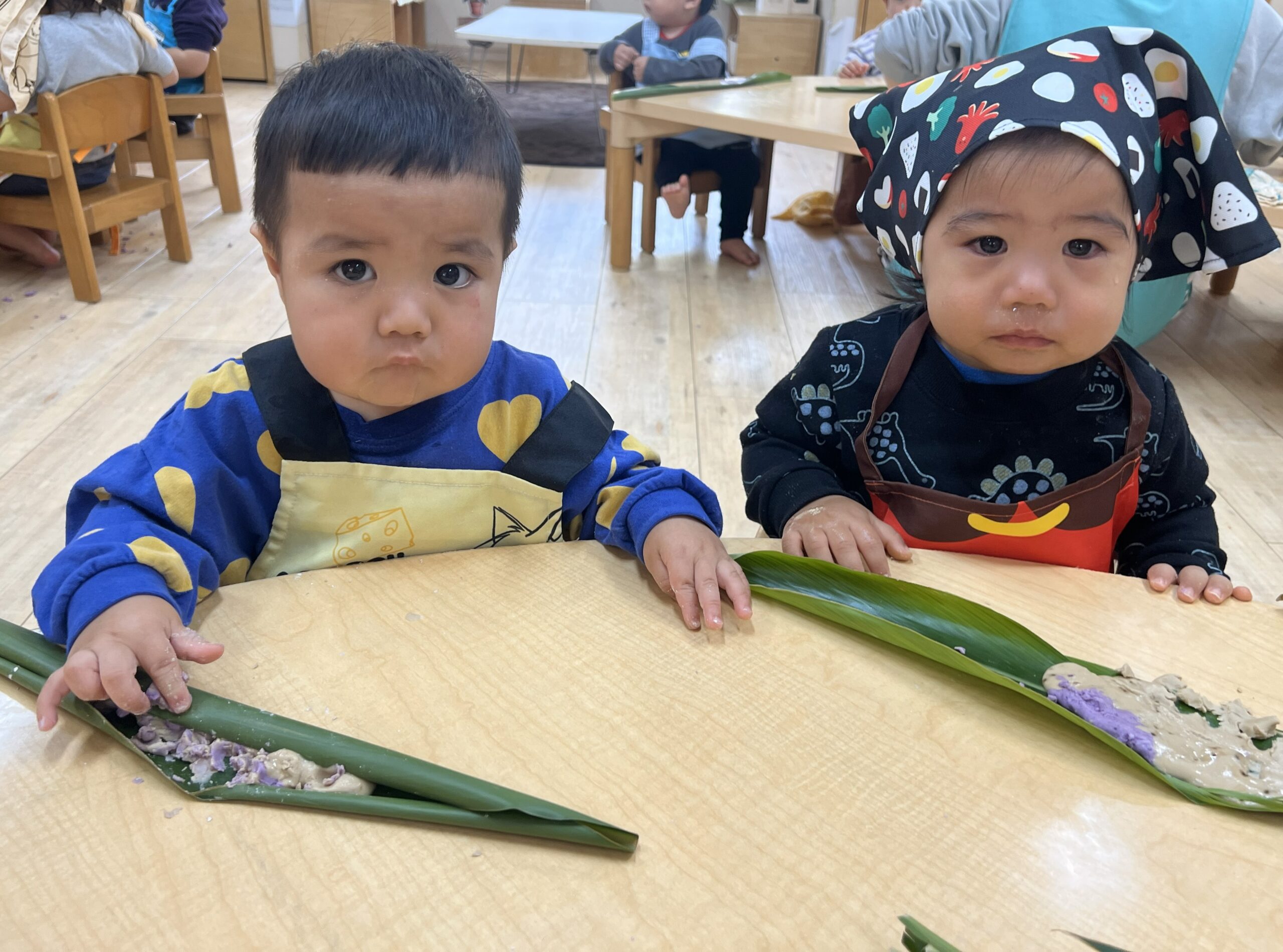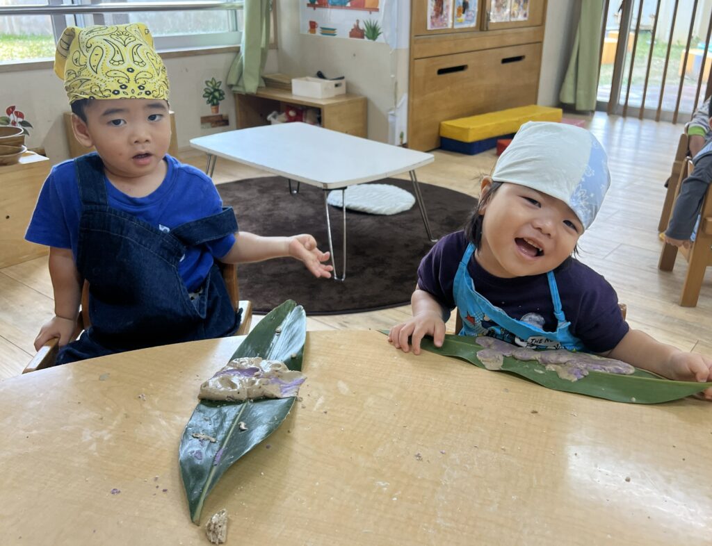 みなさんこんにちは(^▽^)/ 星のしずく保育園のブログへようこそ! 今日は子どもたちと一緒にムーチー作りをしましたよ! 餅をこねたり、葉っぱで包んだり、子ども達に教えながら一緒に楽しみました!💕 健康祈願✨